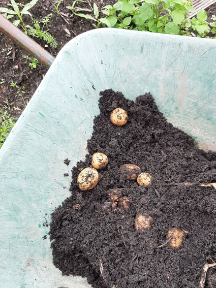 Als ik de potten nog een keer opgehoogd zou hebben dan zaten er meer aardappelen aan maar door alle regen is daar niets van gekomen.